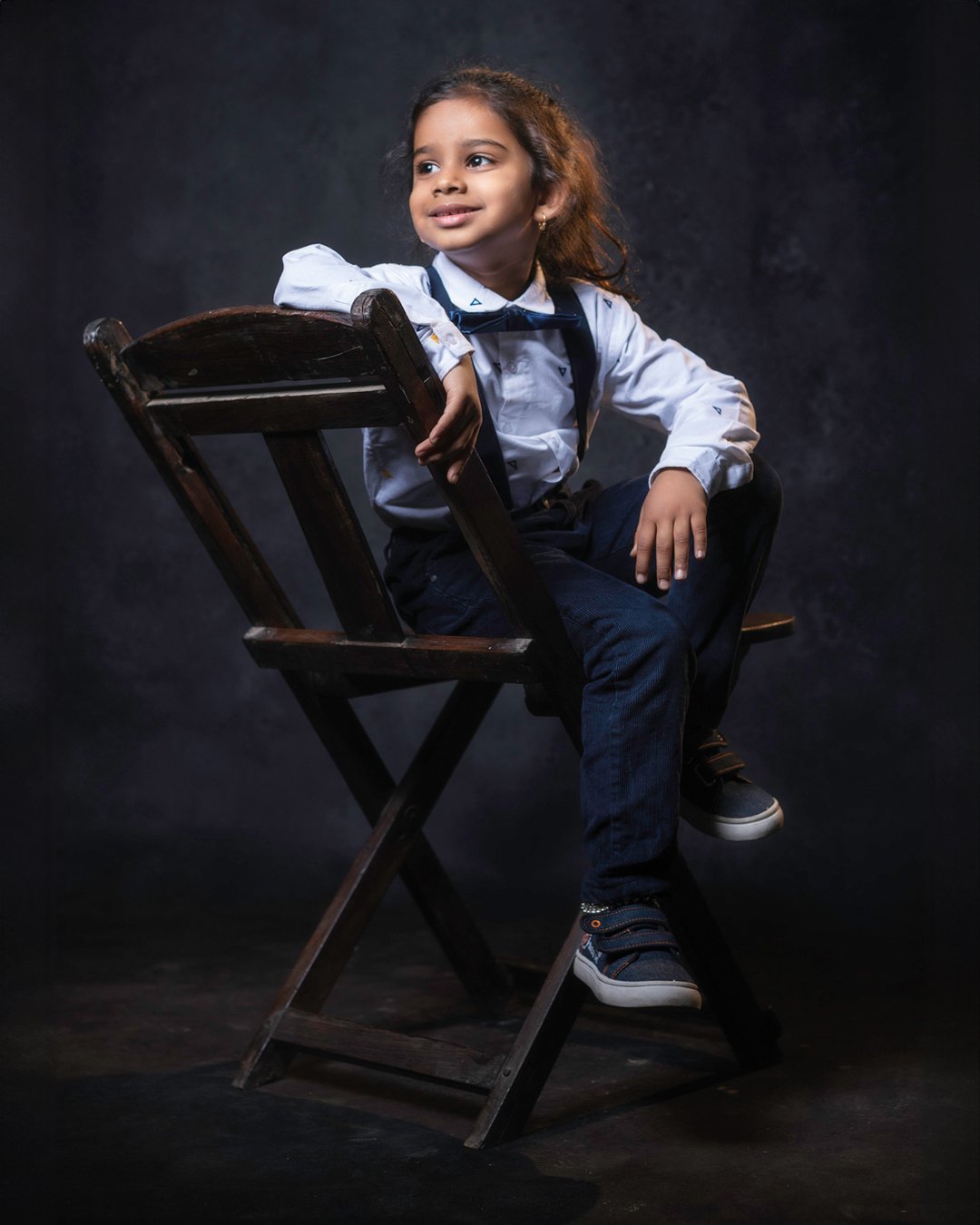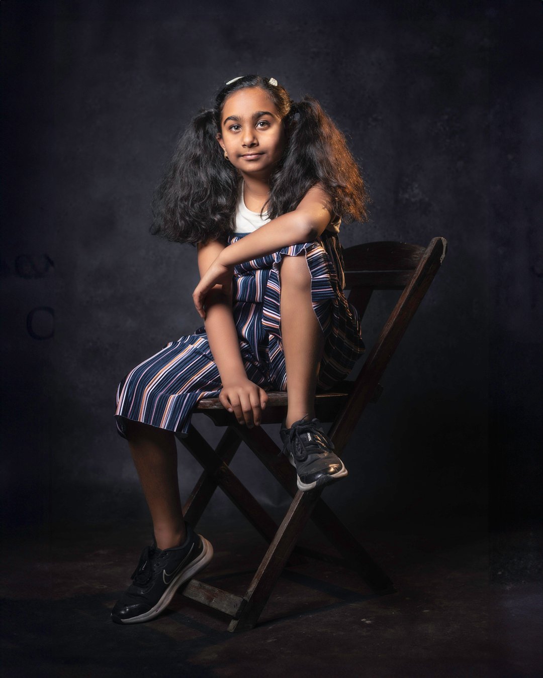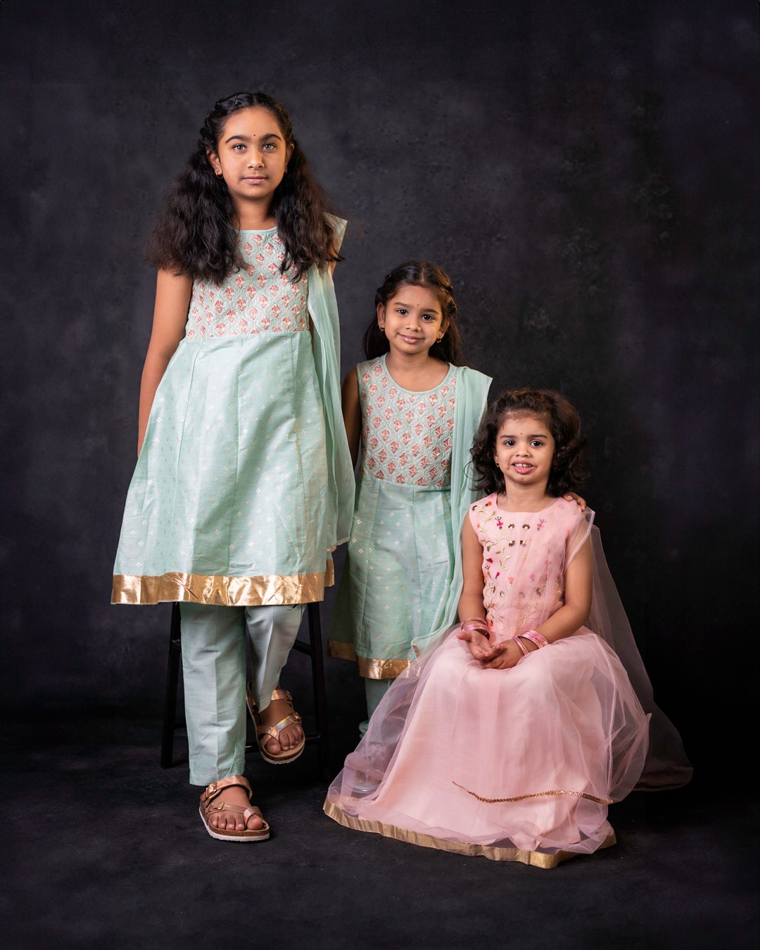 With a quick setup at their home, we used a black slate backdrop and a unique lighting arrangement to highlight the children in the most natural and flattering way. We even brought in a gorgeous antique chair for the kids to pose with, adding a timeless touch to the shots. The end result? Pure magic!